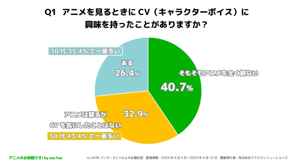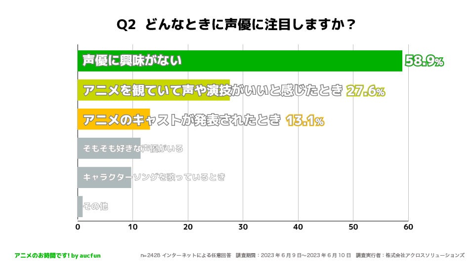 株式会社アクロスソリューションズと株式会社オークファンが共同運営しているアニメのお時間です!(URL:https://aucfan.com/vod/)は、20歳〜59歳の男女2428人を対象に「声優に関するアンケート調査」を実施しました。