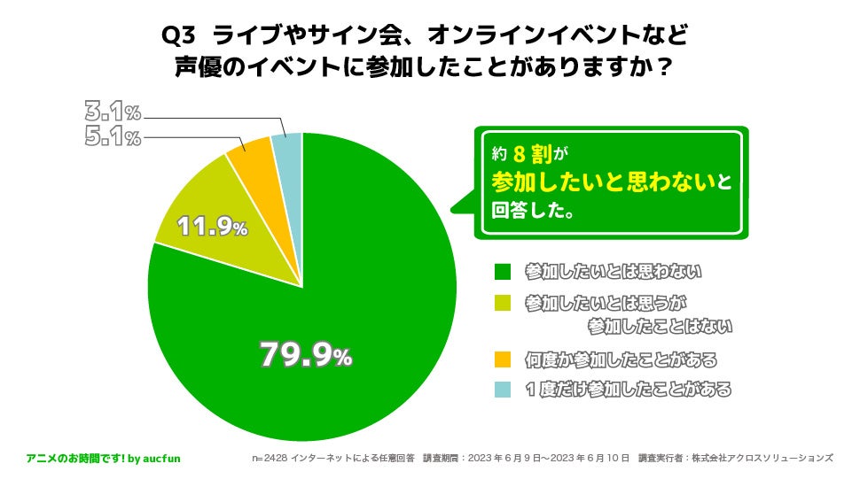 これはQ1でアニメを全く観ないと回答した割合よりも18.2%高く、アニメを観る人でも約3分の1程度の人が声優には興味がないことが伺えました。