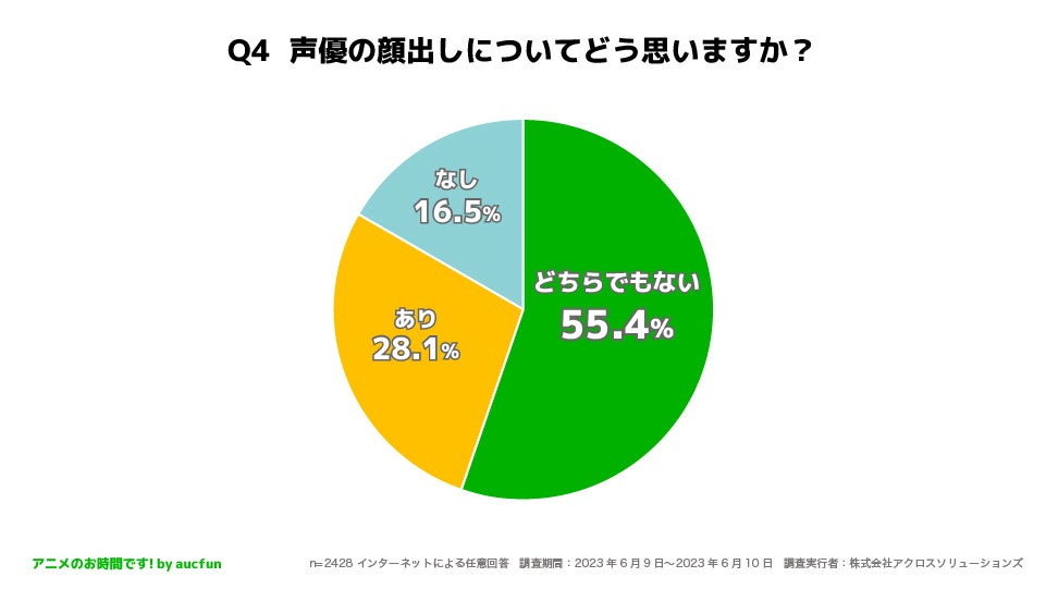声優の顔出しについて、「どちらでもない」と答えた人が55.4%と半数を上回りました。