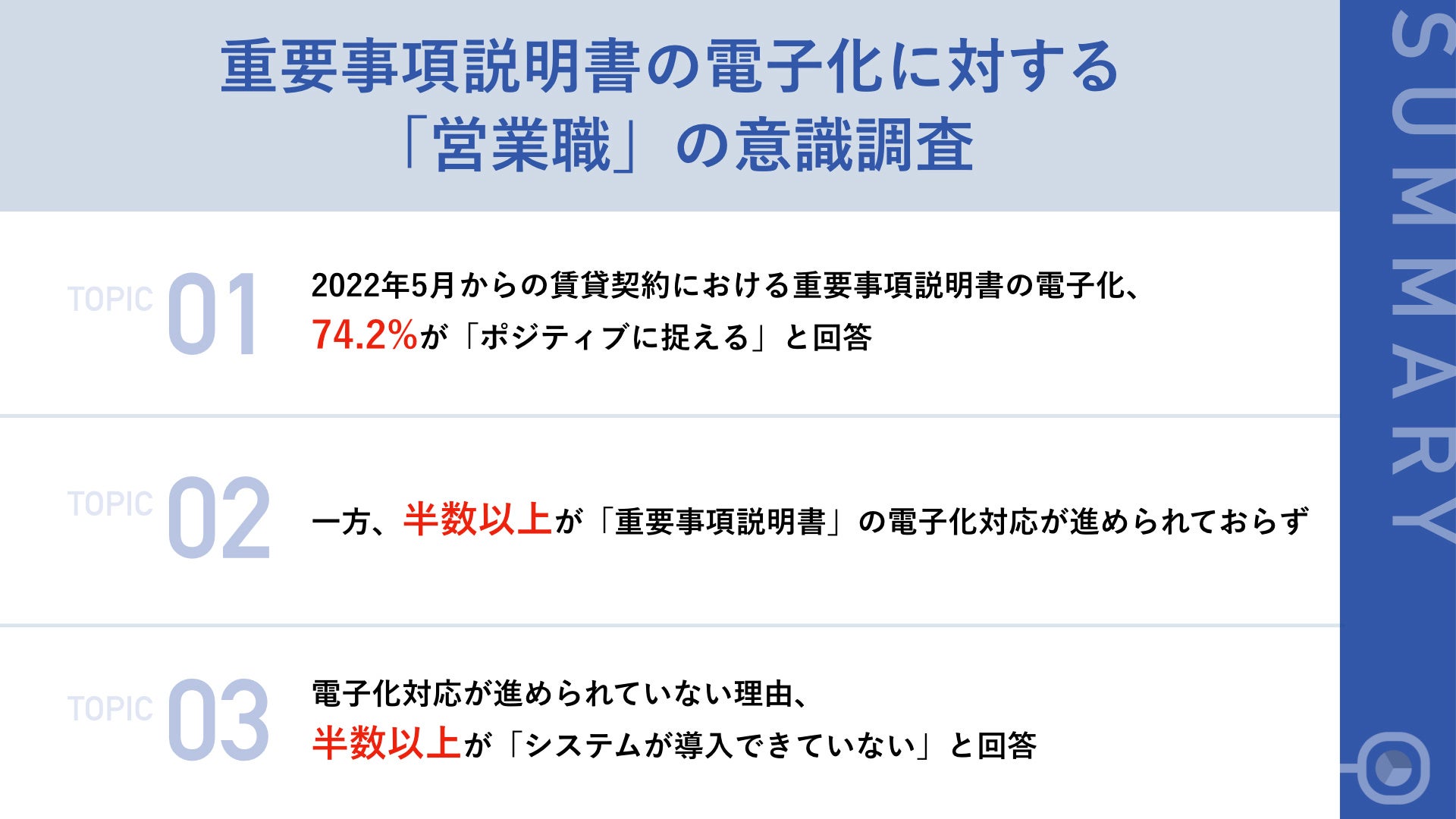 - 2022年5月からの賃貸契約における重要事項説明書の電子化、74.2%が「ポジティブ」と回答