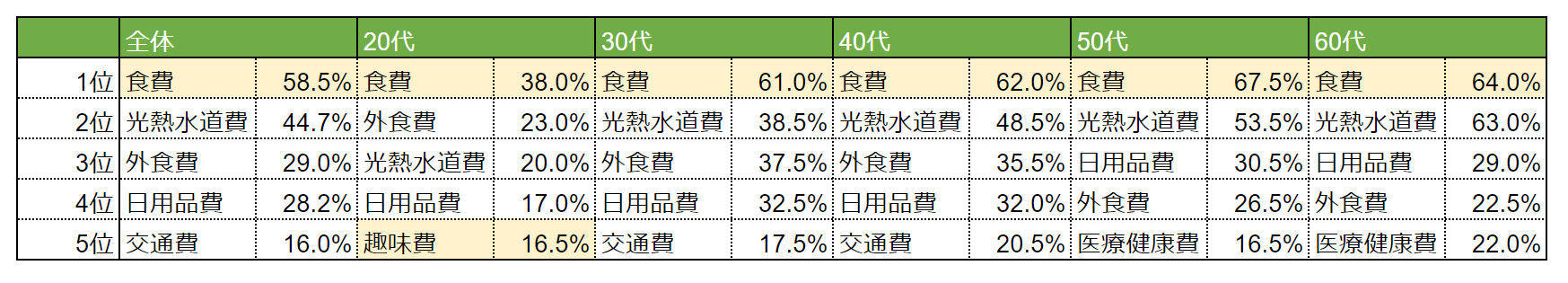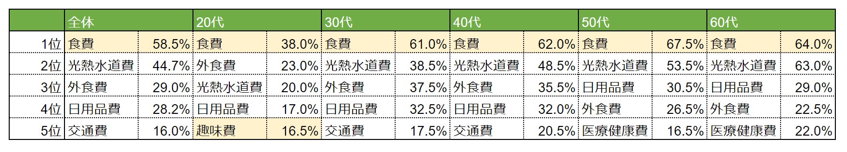 ・50代、60代は共通して「食費」が1位。唯一5万円台の支出の結果に。