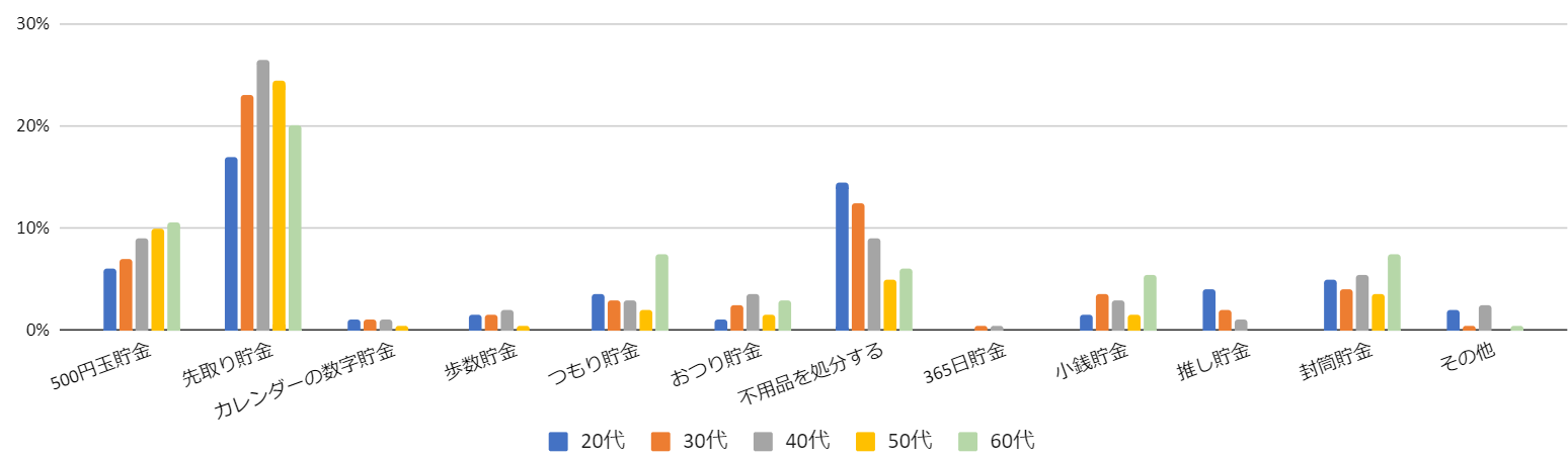 ・ 「先取り貯金」「不用品の処分」「500円玉貯金」が全世代で人気。