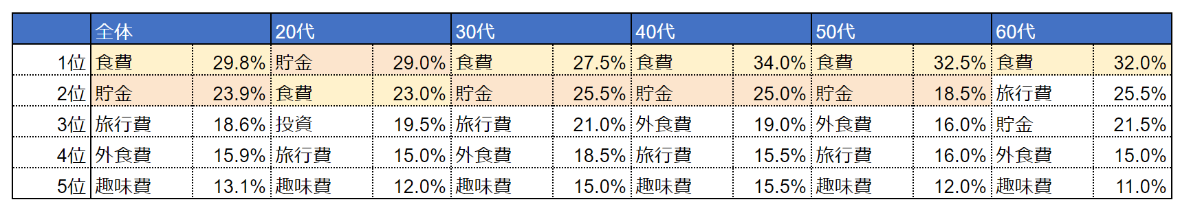 ・ 現役世代(30代~50代)すべてで「食費」が1位。(20代は「貯金」が1位)