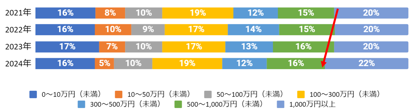 24年度、1000万円以上の貯金割合が過去最高に(20%→22%、2pt増加)