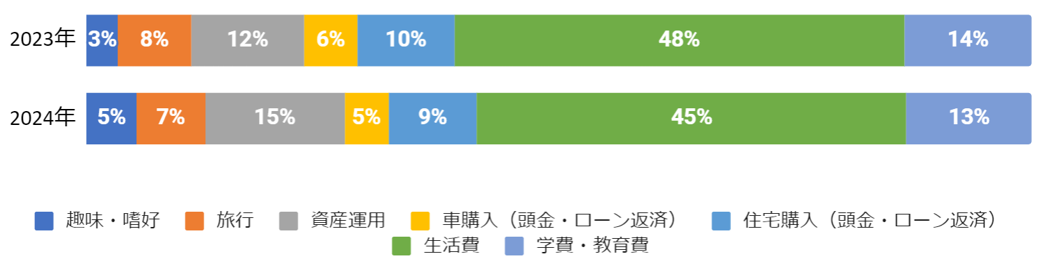 「貯金目的」は23年度から変わらず「生活費」が全年代でトップ、平均45%を占める。