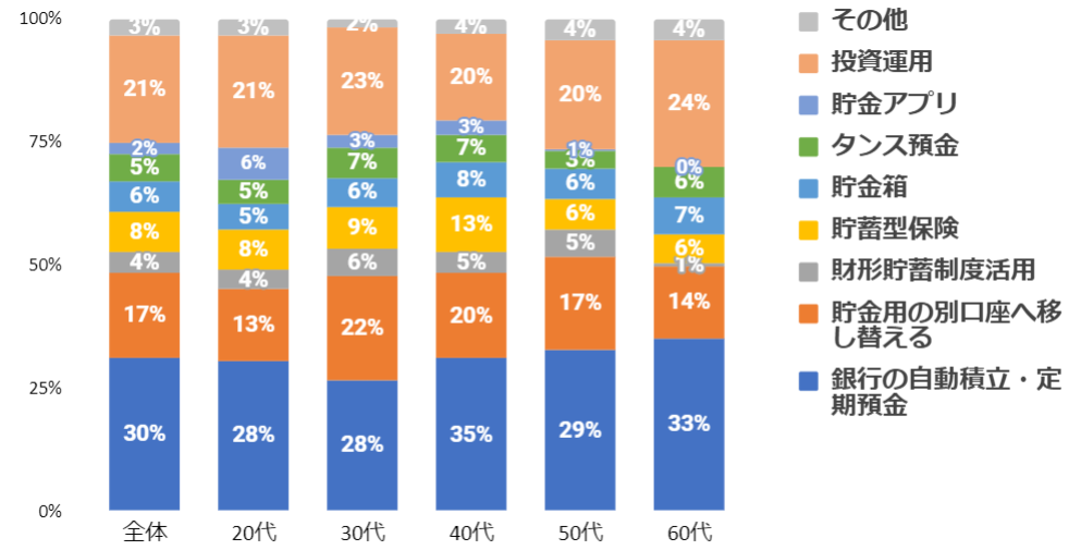 ・ 「銀行の自動積立・定期預金」が最も多く、次いで「投資運用」が人気。23年度2位だった「別口座移し替え」を上回る結果。投資人口が年々、増加していることが伺える。