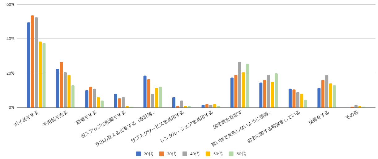 貯金を増やすために(お金を有意義に利用するため)におこなっていること(世代別比較)