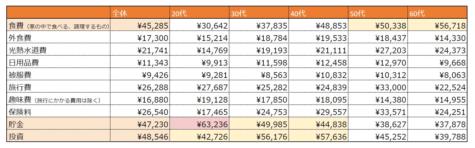 ・全体トップ3は「投資」「貯金」「食費」、すべて4万円後半の支出額となった。