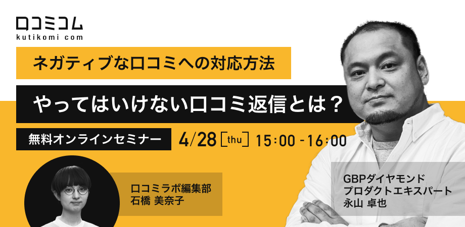 「やってはいけない口コミ返信」とは?ネガティブな口コミへの対応方法セミナーを口コミコムが開催【4/28(木)オンライン】