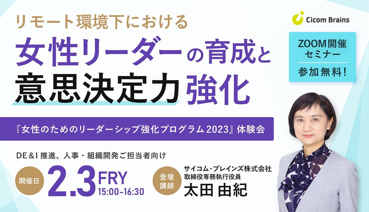 国内外で企業の人材育成を支援するサイコム・ブレインズ株式会社(東京都千代田区、代表取締役社長 西田忠康)は、来る2023年2月3日(金)、取締役専務執行役員の太田由紀によるオンラインセミナー『リモート環境下における女性リーダーの育成と「意思決定力強化」~『女性のためのリーダーシップ強化プログラム2023』体験会~』を開催いたします。