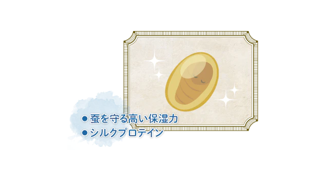 蚕の幼虫は繭の中で眠りにつきます。その時に乾燥から守る為、繭には保湿力が高いシルクプロテイン (セリシン・フィブロイン) というタンパク質が含まれています。シルクプロテインの保湿力はかなりのもので、小さな幼虫が眠っている間、ずっと干からびないように守り続けます。