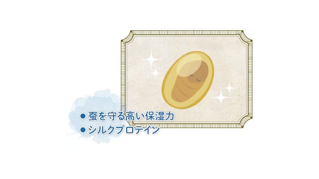 また、繭の中で眠りにつく幼虫を眠っている間ずっと乾燥から守るため、保湿力が高い「シルクプロテイン」というタンパク質が含まれています。