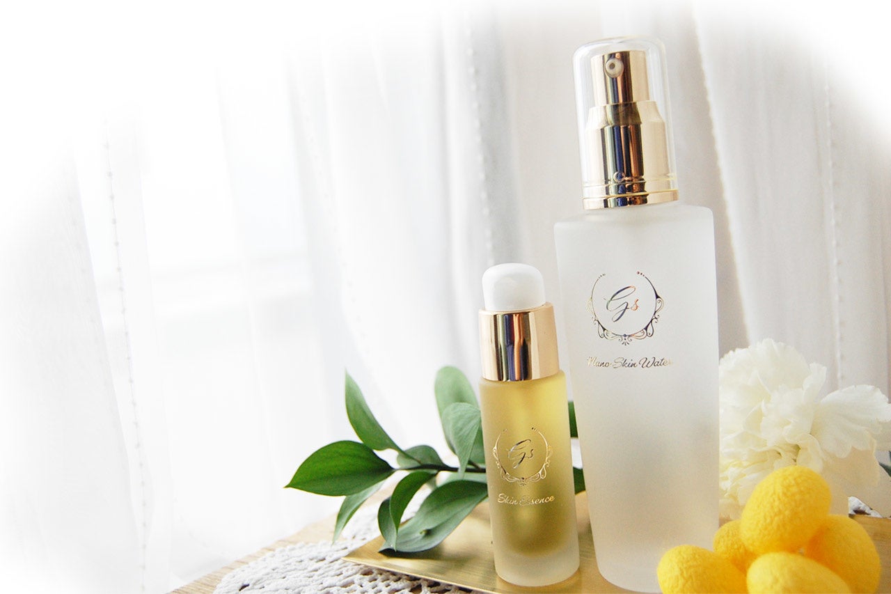 化粧水はシルクとナノバブル炭酸水のパワーが実感できる処方、美容液はゴールドシルク98.5%配合のほぼ原液です。