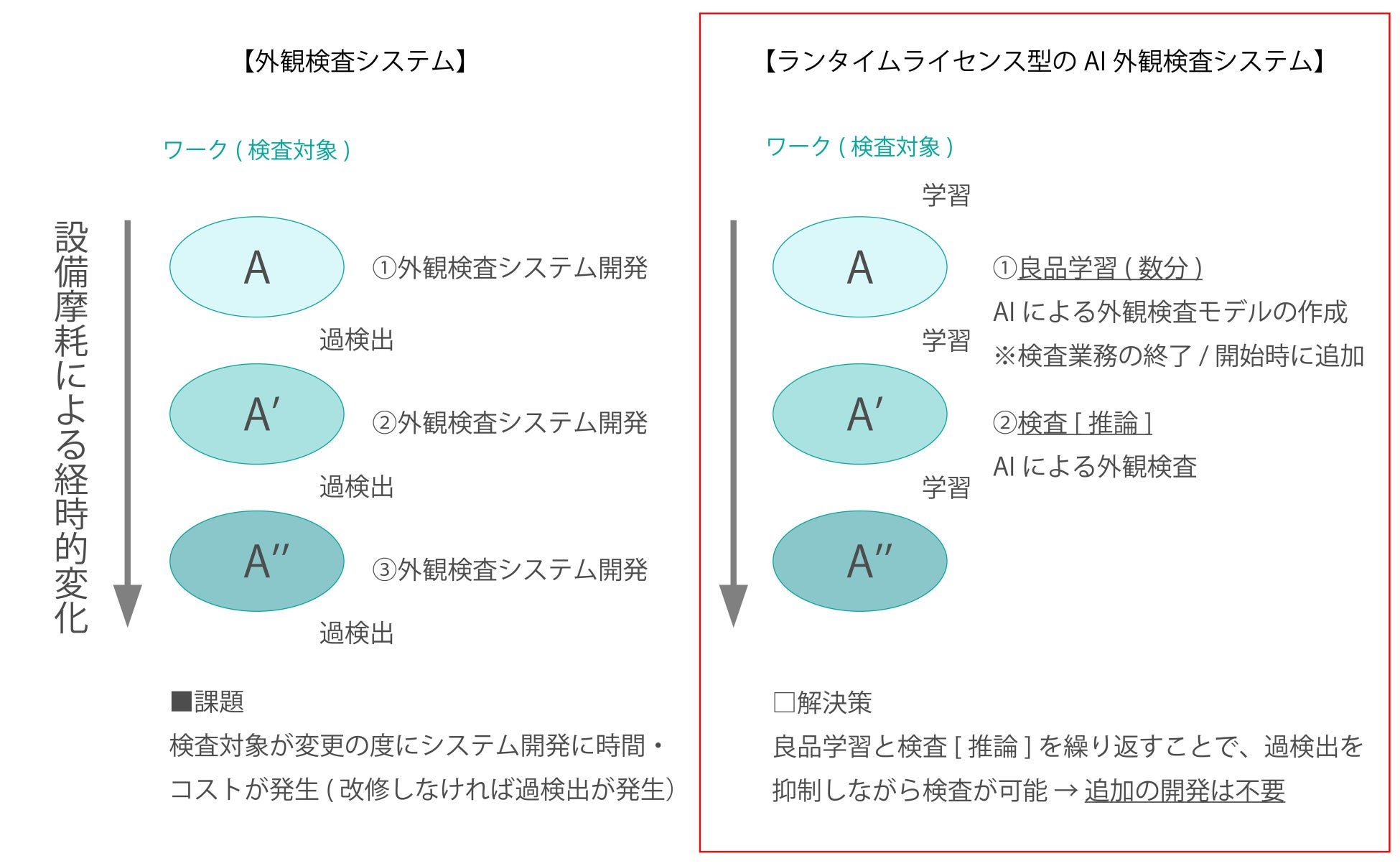 従来の外観検査システムの場合、検査設備や検査対象の摩耗などによる経時的変化によって、検査対象が変化する度にシステム開発が必要で、改修しなければ過検出が発生するといった課題がありました。「ランタイムライセンス」では、AIが検査工程の稼働を進めながら、経時的変化を学習・対応することにより、システムの追加開発にかかる時間やコストを削減します。