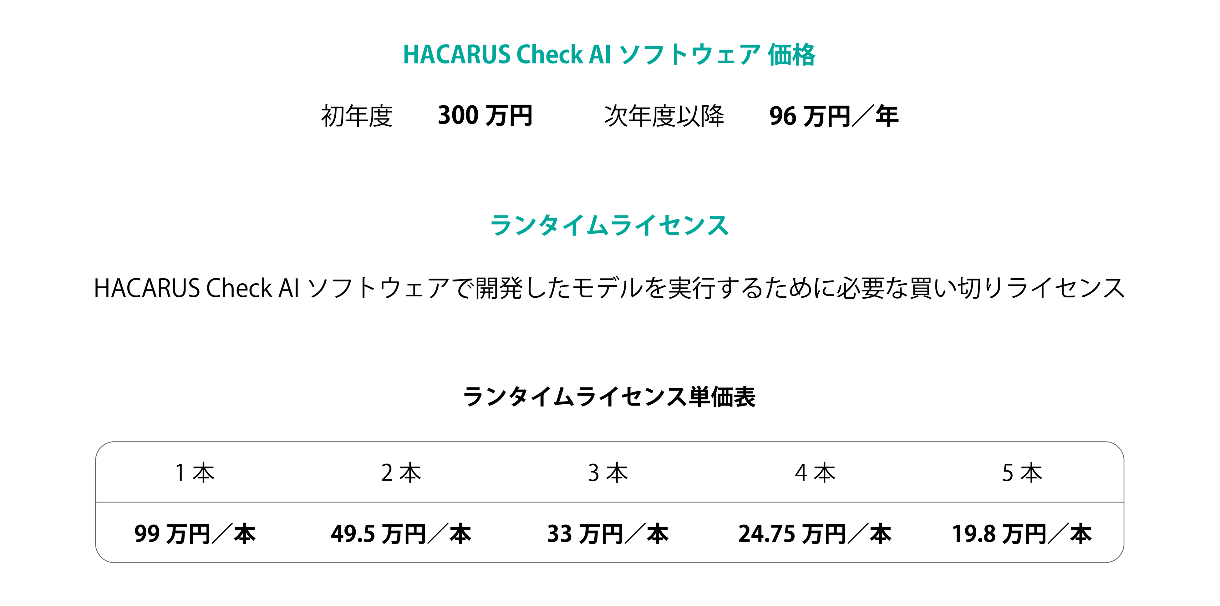 「HACARUS Check AIソフトウェア」はAIによる外観検査を実現するソフトウェアで、撮像装置を自前で準備をしたい場合やすでに使用中の検査設備がある場合に、ソフトウェア単体での導入が可能な製品です。「ランタイムライセンス」とは、HACARUSのAI外観検査システムを導入した後でも、AIが追加学習を行うことによって、検査条件やワーク(検査対象)の経時的変化に対応して、過検知の発生を抑える機能を備えたライセンスです。また、既にHACARUSのAI外観検査システムをご使用いただいているお客様に対しても、このライセンスへの変更は可能です。