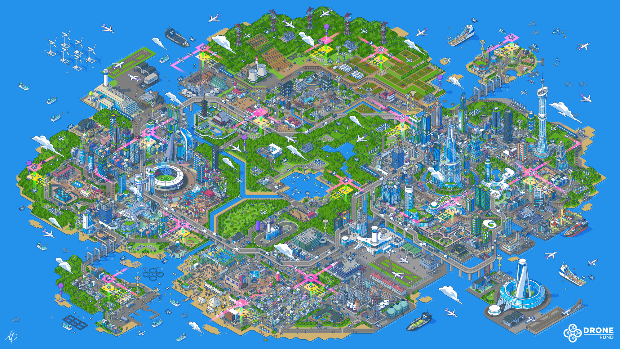 DRONE FUNDでは「2050年のドローン・エアモビリティ前提社会」をイメージしたイラストを制作いたしました。