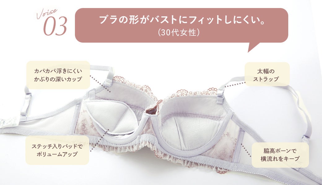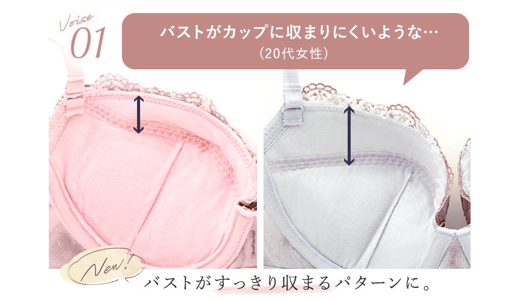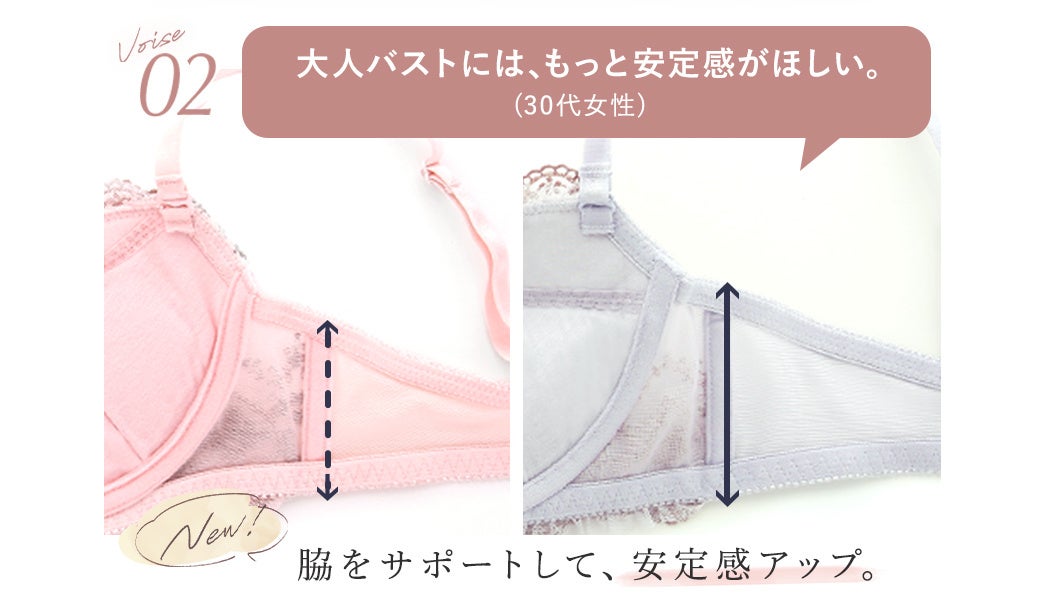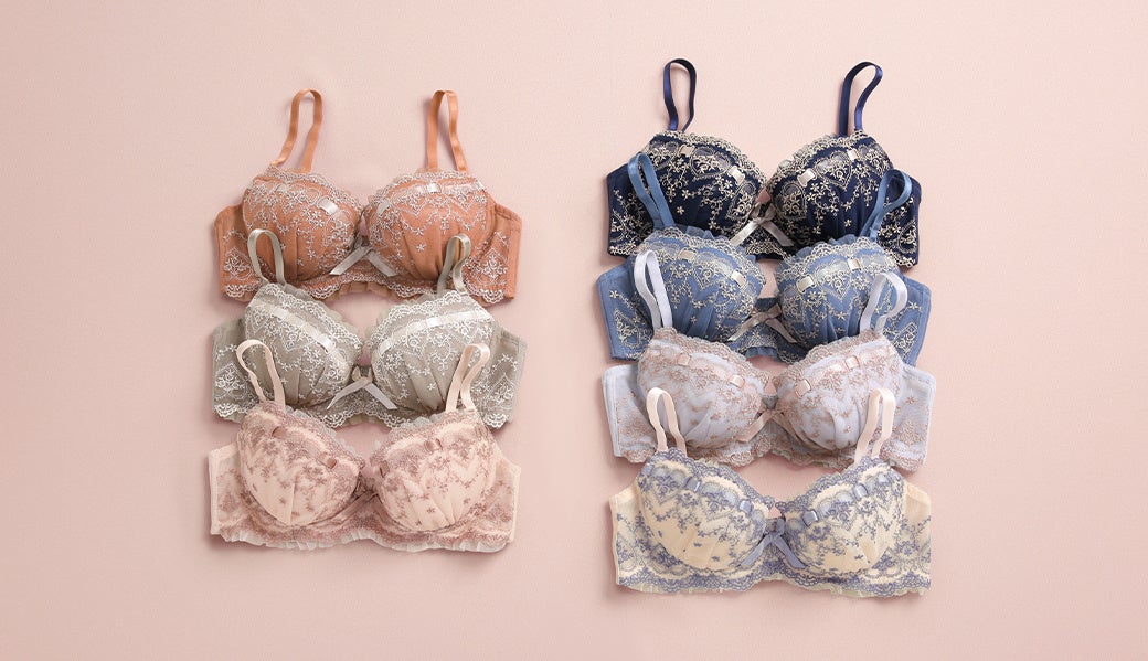 お客様の声をもとに、よりバストに寄添う設計へとリニューアルしたロングセラーブラセットから、新たにフェミニンな新色ベビーピンクが入荷しました。レースやリボンの色を同系色にし、大人可愛いカラーリング。新色を含め7色展開のコレクションは、カラーバリエーションが豊富な点も人気のひとつ。ソフトな着け心地でバストをしっかり収めてフィットするカップは、幅広い年代・体型の方に合いやすい仕様となっています。
