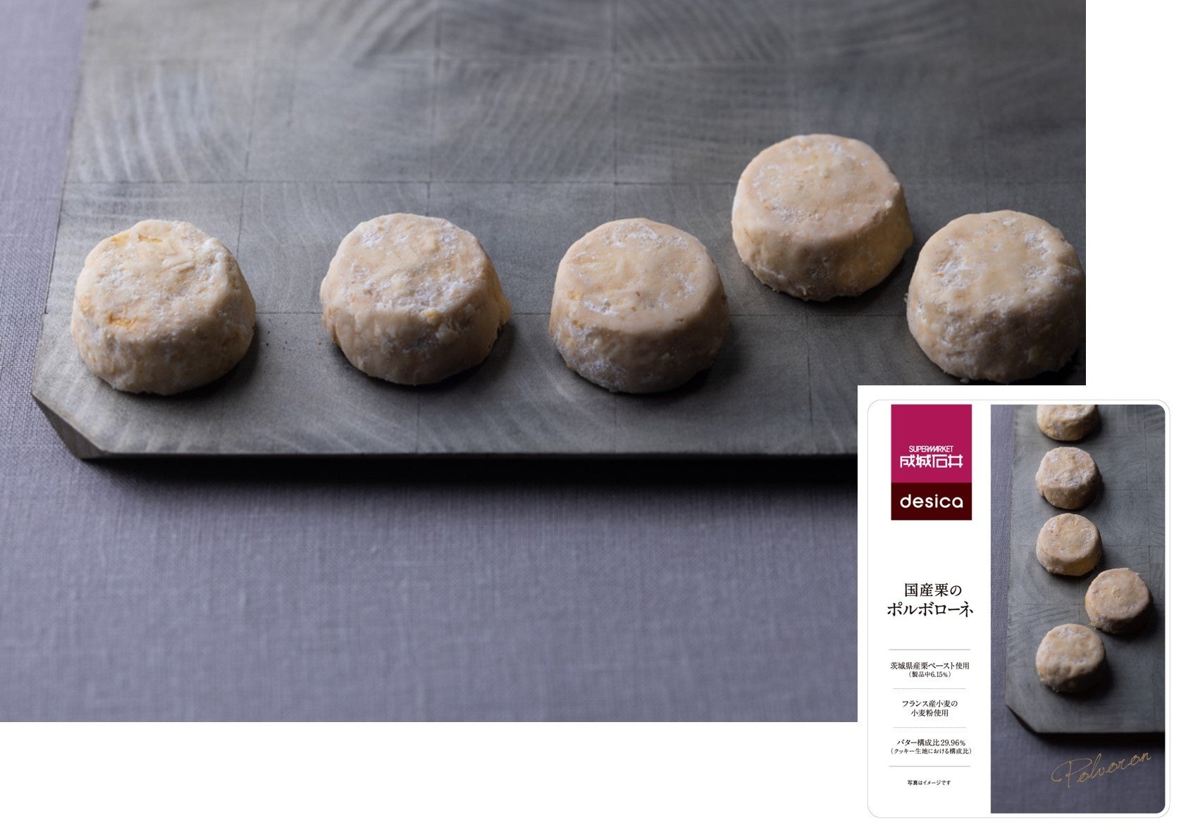 成城石井は本年、日本の四季の旬をお客様にお届けする「四季プロジェクト」を展開しています。秋にはこの季節の味覚の定番「いも・栗・かぼちゃ」をベースにした新商品を多数投入。成城石井 desicaシリーズで売上個数No.1のポルボローネに、国産栗を使用した本商品が好評いただいています。