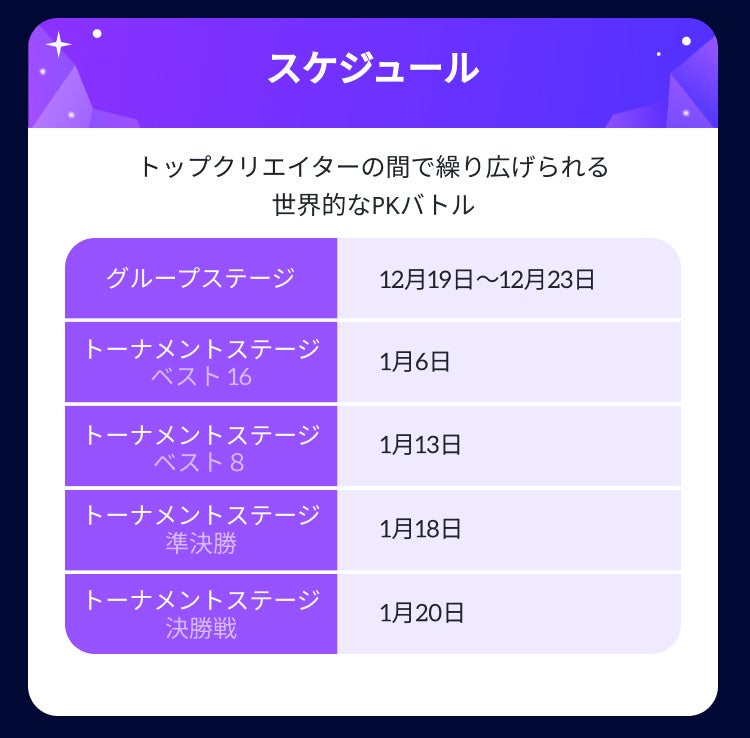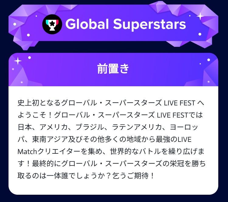 TikTok LIVE Global Superstarsは、2022年12月20日〜2023年1月20日にてTikTok アプリ上にて開催され、日本、アメリカ、ブラジル、ラテンアメリカ、ヨーロッパ、東南アジア及びその他多くの地域から、最強のLIVE Matchクリエイター全48名が参戦してバトルを行い優勝者を決めるイベントです。