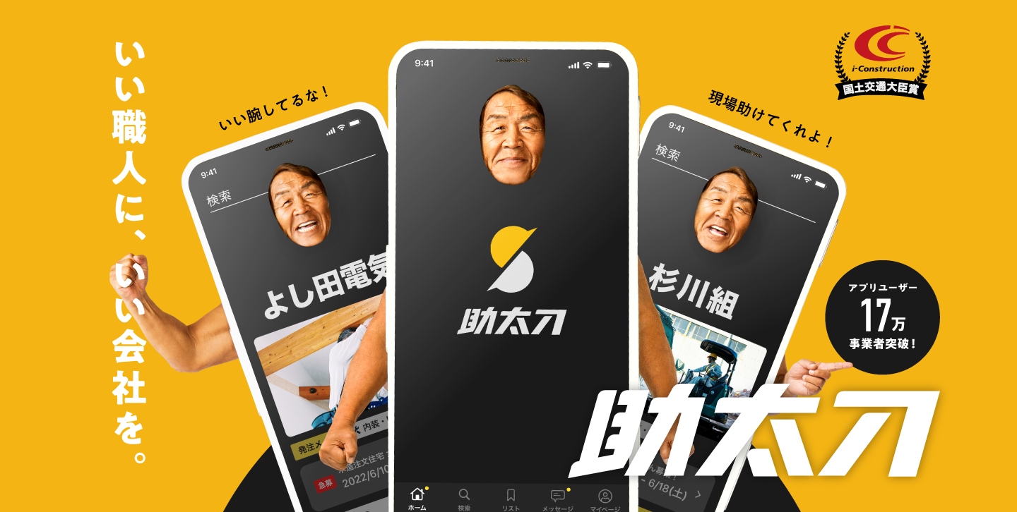 当社は「建設現場を魅力ある職場に。」というビジョンを掲げ、職人と工事会社の新しい出会いが見つかるアプリ「助太刀」を運営しております。登録事業者数は17万を超え、建設業界におけるマッチング領域では圧倒的なシェアを誇ります。「助太刀」は発注側の工事会社と受注側の職人・工務店をマッチングし、長期的な取引先と出会えるサービスとなっております。また、「助太刀社員」においては、求人意欲のある工事会社がアプリ内で求人広告の掲載および職人へのダイレクトスカウトが送付できるサービスとなっております。このように、助太刀は取引先探し・採用どちらからも人手不足解決をサポートしており、今後は、建設業界のあらゆる課題を解決するべく提供サービスを更に拡大してまいります。
