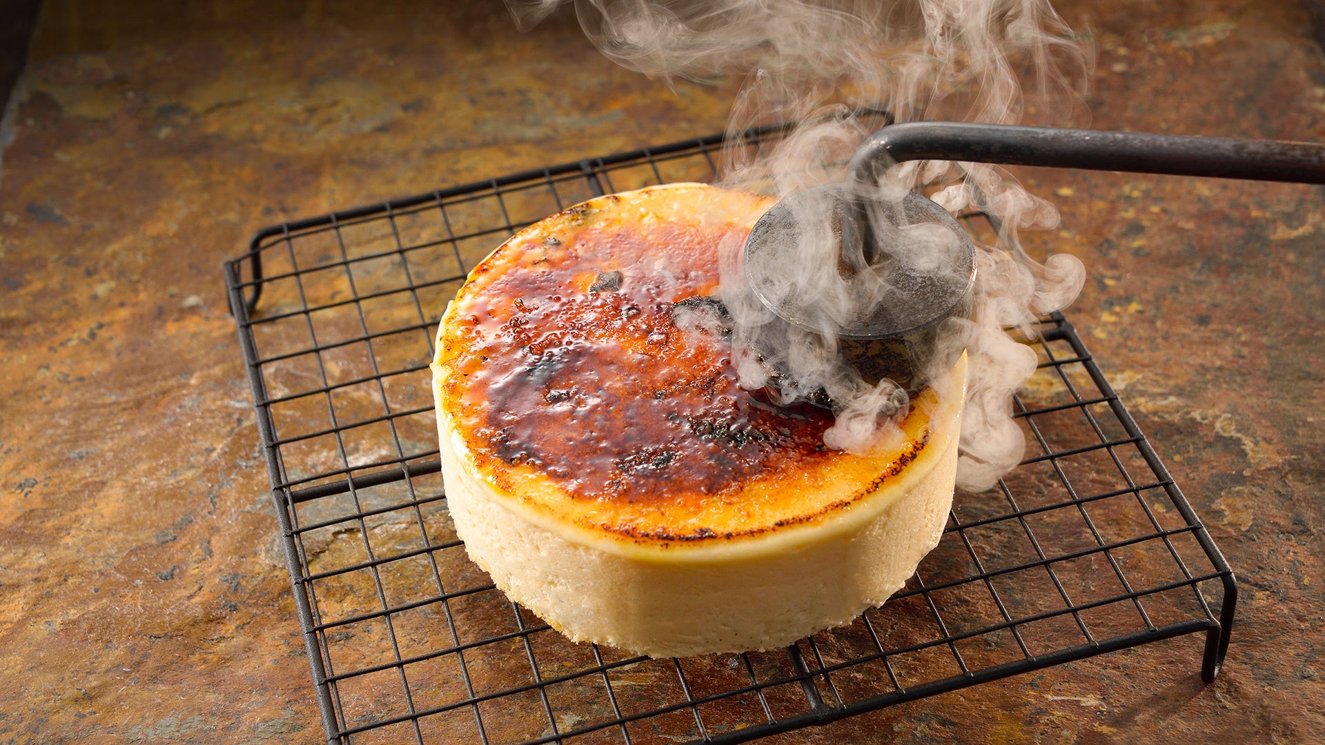 下層はベイクドチーズ、上層はイタリアンメレンゲを使ったシブーストで表面のカソナードを焦がし特製のアプリコットのコンフィチュールをコーティングしました。