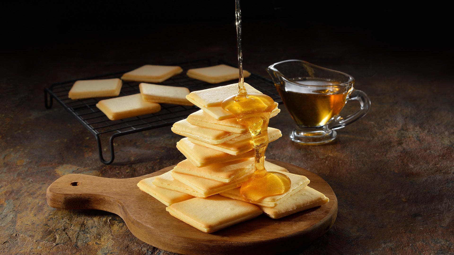 クッキーをトーストに見立て、メープル香るホワイトチョコレートをサンドしたフレンチトースト味のクッキーです。