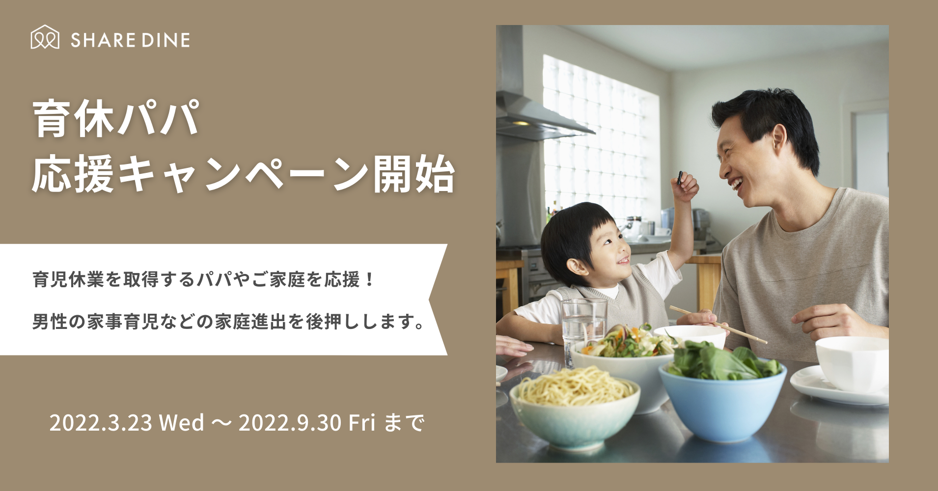 栄養士から一流レストランシェフまで約1,900名のシェフが登録する作り置きシェフサービス「シェアダイン」を運営する株式会社シェアダイン(共同代表:井出有希、本社:東京都港区、以下シェアダイン)は、4月からの育児・介護休業法の改正を受け、育児休業を取得するパパやご家庭を応援し、男性の家事・育児などの家庭進出を後押しするため、育休パパ応援キャンペーンを3月23日より開始します。