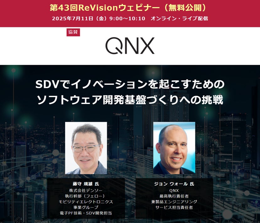 【無料WEBセミナー】 デンソーとQNXから講師を迎え、「SDVでイノベーションを起こすためのソフトウェア開発基盤づくりへの挑戦」をテーマにライブ配信 ― 7月11日(金)