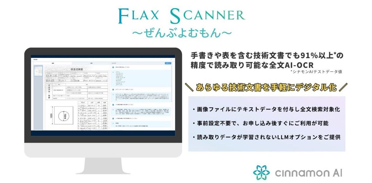 シナモンAI、技術文書をデジタル化する、読み取り精度91%*の全文AI-OCR「Flax Scanner ぜんぶよむもん」のオンプレミス版を提供開始