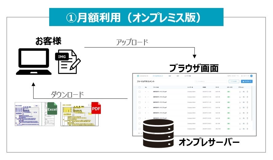お客様環境に構築し、お客様ご自身でファイルアップロード/ダウンロードを実施いただくプラン。費用については、当社問い合わせフォーム( https://go.cinnamon.ai/inquiry.html )よりご連絡ください。