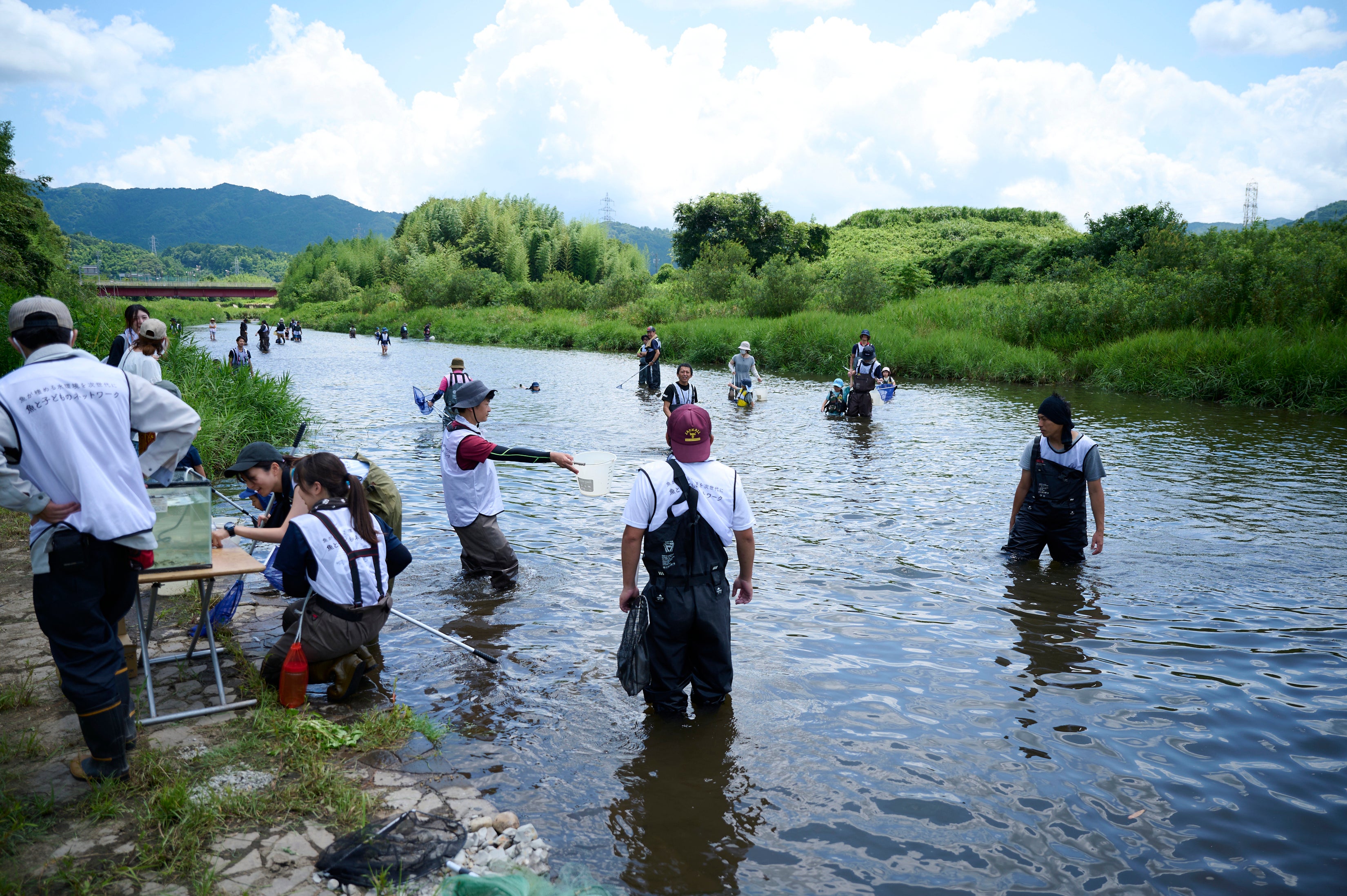 参加者は服部川を含む木津川の水系や水質について学んだ後、川に入り、タモ網を使って水中の生き物を捕獲。子どもたちは歓声を上げながら冷たい水と生き物との触れ合いを楽しみました。「魚と子どものネットワーク」メンバーによる解説を聞いた後は、捕獲した生き物は川に離し、活動を終えました。