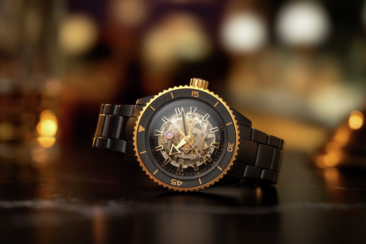 初登場となるこのモデルは、マットブラックのモノブロックケースにローズゴールドの装飾が施され、ブラックに着色されたサファイアクリスタル越しに、ローズゴールドのセンターホイールブリッジを備えたRadoキャリバーR808自動巻ムーブメントを鑑賞できます。力強く大胆な針とインデックス(マットなローズゴールドカラー、ブラックのSuper-Luminova®)が、デザインを引き締めています。