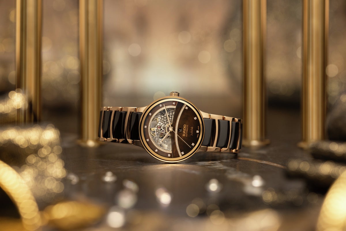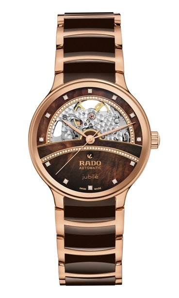 ローズゴールドカラーのケースにダークブラウンのマザーオブパールダイアル、そして12個のダイヤモンドインデックスが配され、エレガントに輝きます。RadoキャリバーR734自動巻ムーブメントが、ダイアルの美しさと複雑な内部構造の両方を讃えています。