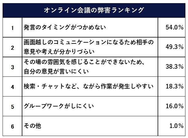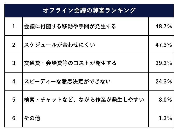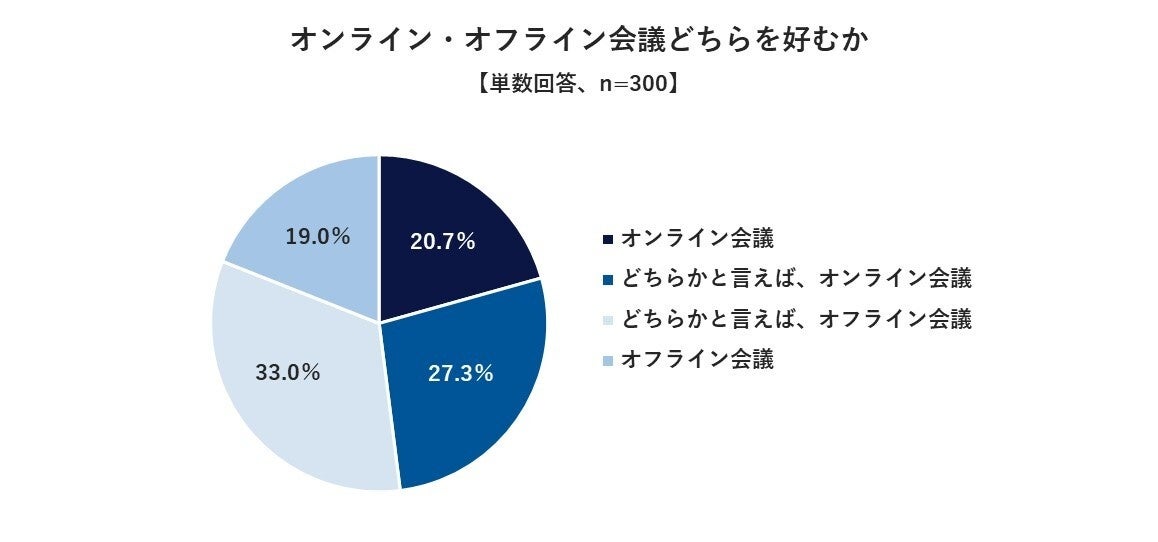 調査対象:全国の従業員数10名以上の企業に勤める20歳~59歳の男女で、直近3年以内にお勤めの企業でオンライン会議・オフライン会議どちらも出席したことがある方、オフライン会議のみ出席したことがある方