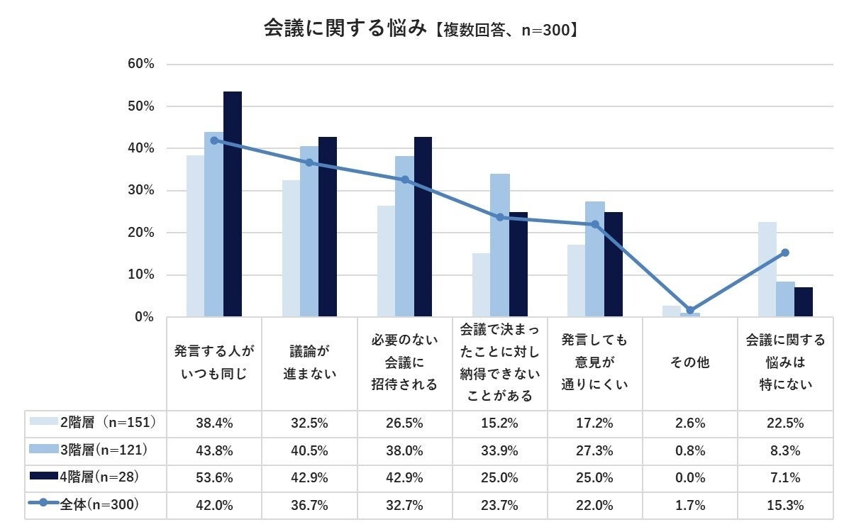 「識学」を使った経営・組織コンサルティングや従業員向け研修を展開する株式会社識学(本社:東京都品川区、代表取締役社長:安藤広大)は、2022年7月27日(水)~8月1日(月)「会議に関する調査」を行いました。その結果、85.0%の方が無駄だと思った会議が過去にあったと回答しました。また、通常どういった階層で会議を行うか聞いたところ、「一般社員、直属の上司」などの「2階層」で会議を行う方が50.3%でした。続いて「一般社員、課長、部長」などの「3階層」で会議を行う方が40.3%、「一般社員、課長、部長、社長」などの4階層で会議を行う方が9.3%で、「3階層」「4階層」の回答割合が49.6%と約半数に至っていることがわかりました。また、会議についての悩みを聞いたところ、2階層で会議をしている人は「会議に関する悩みは特にない」22.5%と3階層の8.3%と比べ、14.2ポイントも差があることが明らかになりました。2階層で会議を行うことで、会議の悩みを減らせるかもしれません。