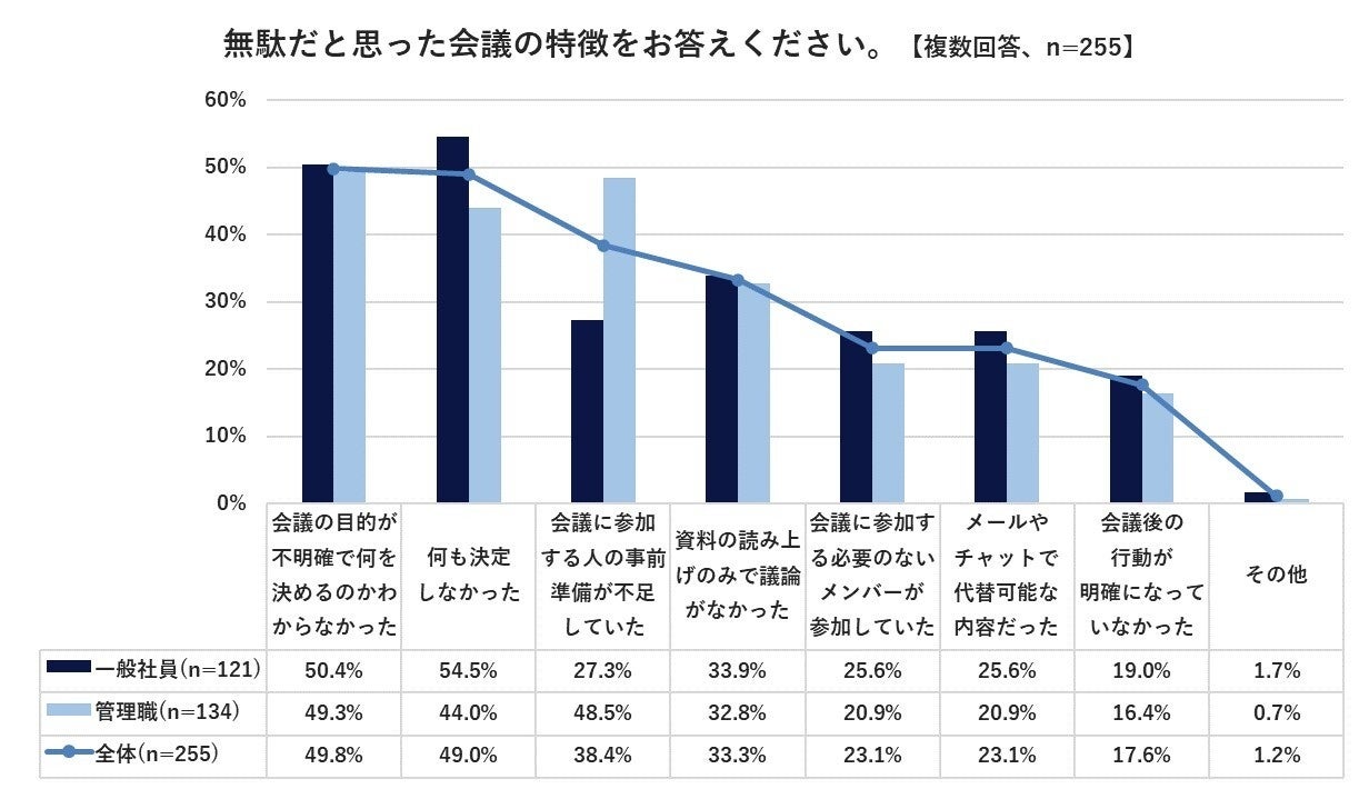 ・無駄だと思った会議がある人85.0%、無駄だと思った会議の特徴「会議の目的が不明確で何を