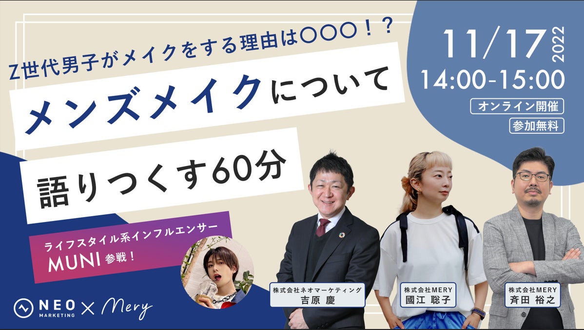 株式会社MERY(本社:東京都千代田区、代表取締役社長:藤田 欣司)は、株式会社ネオマーケティング(本社:東京都渋谷区、代表取締役:橋本 光伸)とZ世代をブランドのターゲットとしているマーケティング担当者向けのウェビナーを「Z世代男子がメイクをする理由は〇〇〇!?メンズメイクについて語りつくす60分」と題し開催することをお知らせします。