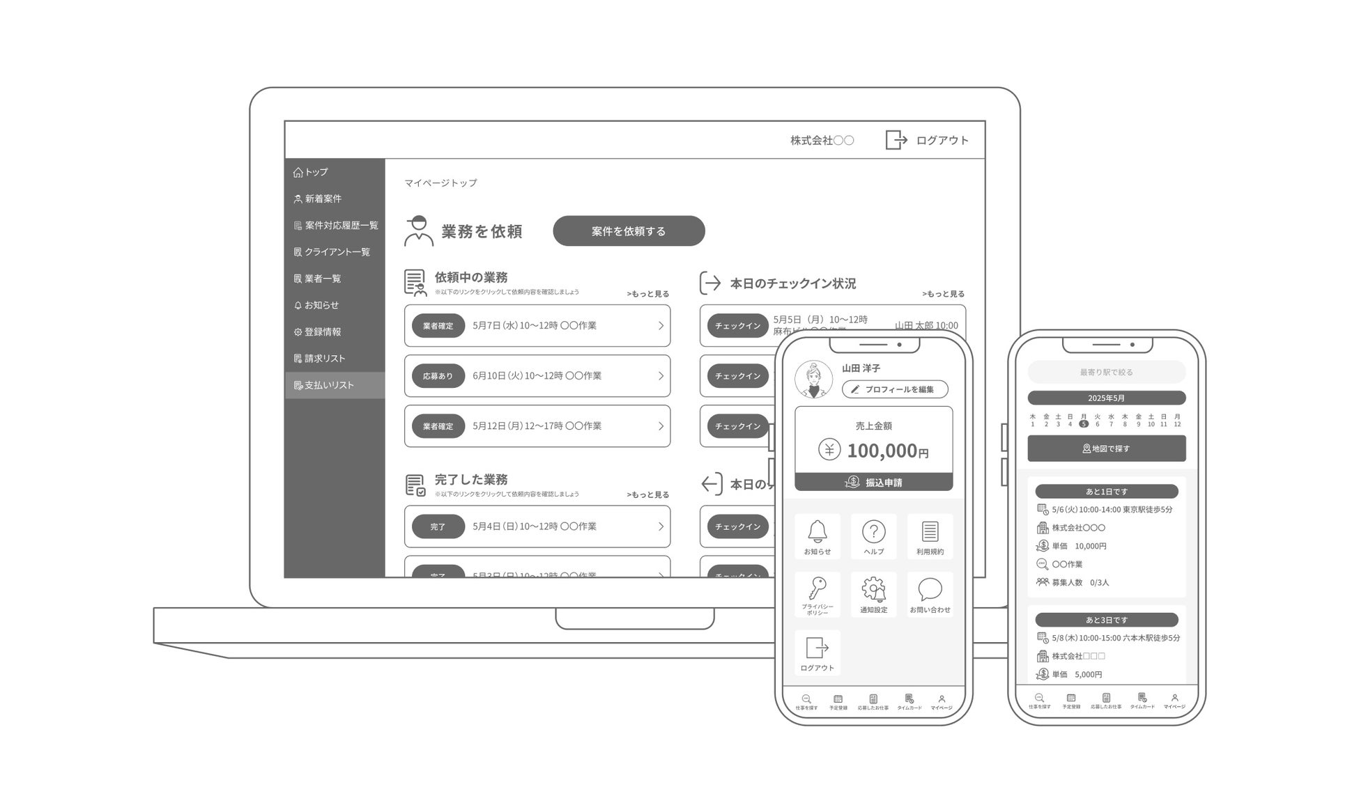 ビルメンテナンスの業務に特化した、仕事を出したい業者と仕事を受けたい業者のマッチングを行うプラットフォーム。募集/応募、受発注、完了報告、評価、報酬管理、など一連の流れでご利用が可能。