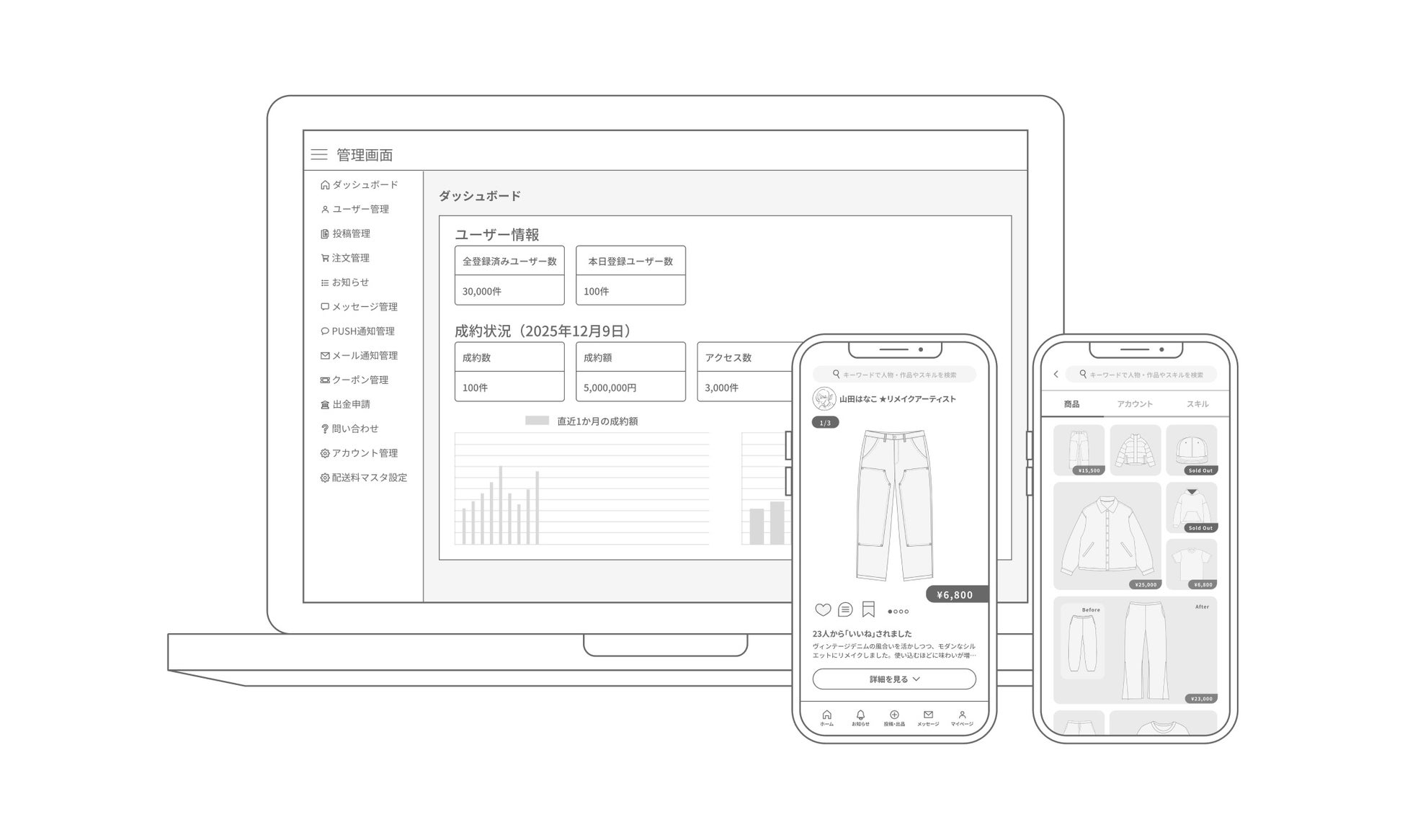 ハンドメイドやリメイク好きな方向けの「リメイク作品」だけでなく「縫製スキル」の売り買いが可能なプラットフォーム。投稿作品に「いいね」をしたり、写真投稿SNSとしてもの体験もご提供。