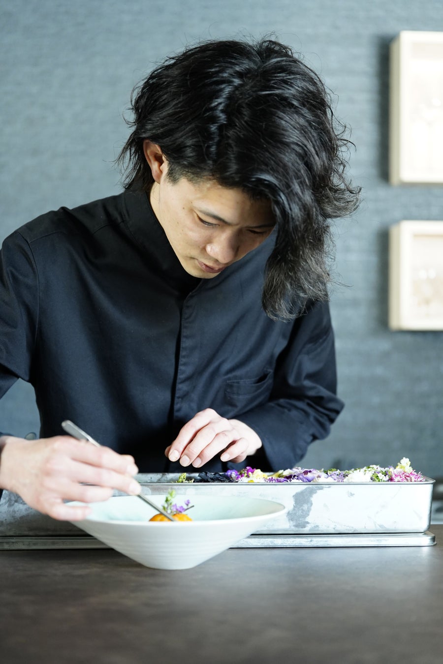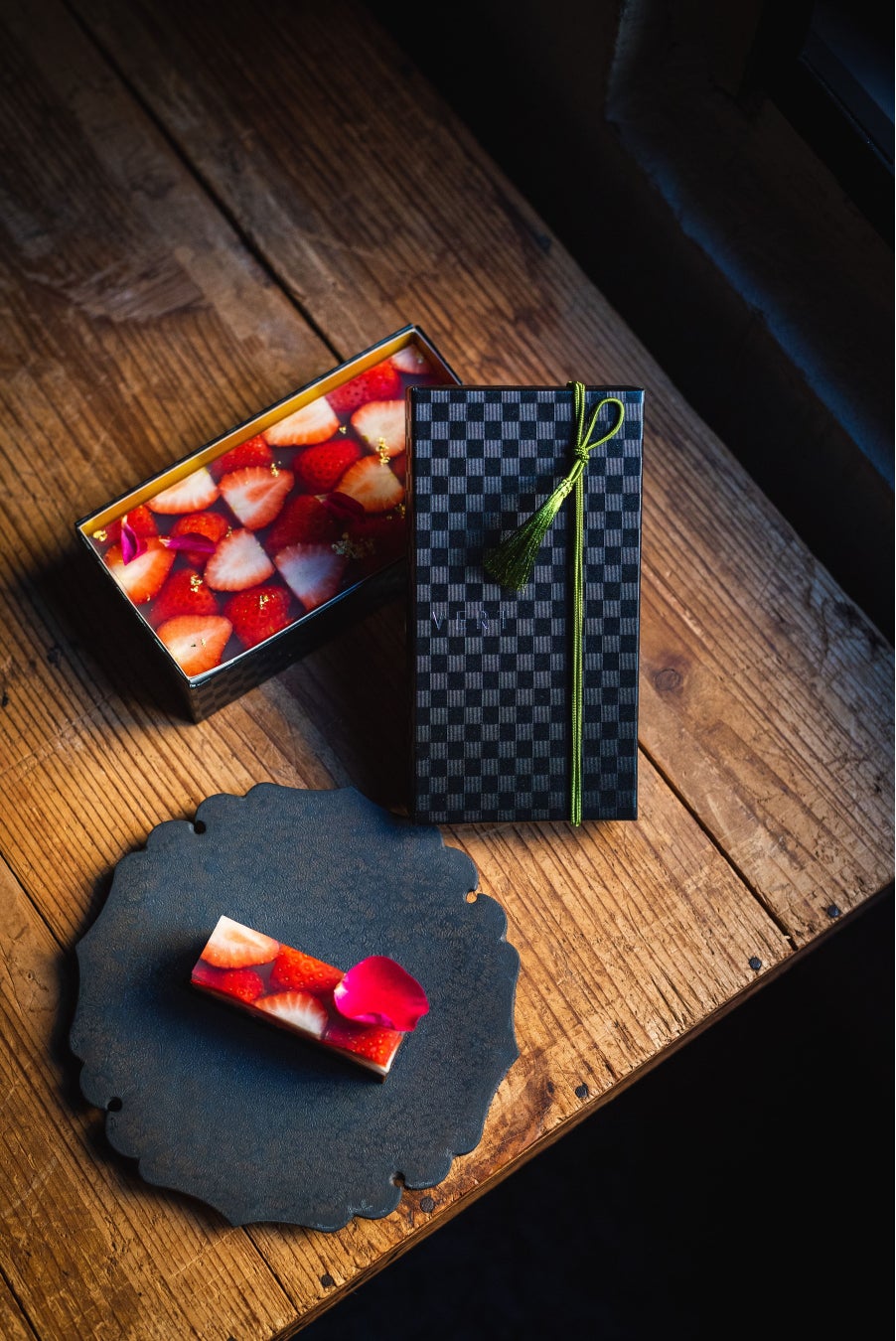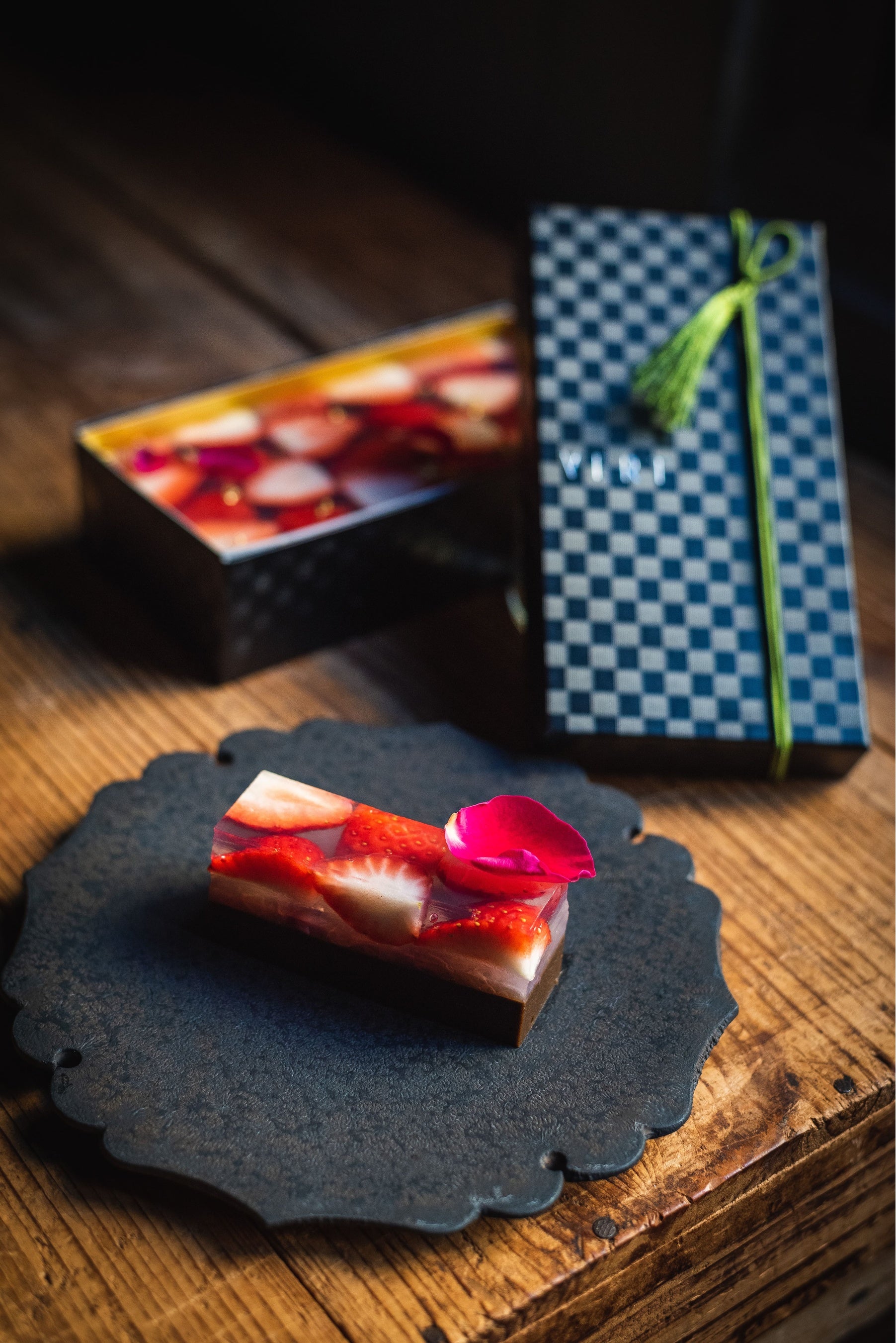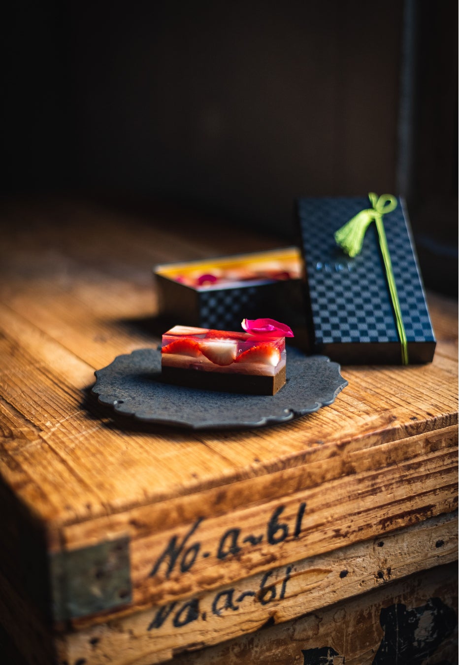 エディブルフラワーの食体験のUP DATEに挑むエディブルフラワー研究所。花のポテンシャルを最大限に引き出した「飾り以外」の創造性を追い求めて、各業界のトップクリエイターとコラボレーションを展開しています。今回はVERTの田中 俊大シェフが「バヌアツカカオ」をテーマに『薔薇とチョコレートの羊羹“儚醇(びょうじゅん)”』が生まれました。栃木県産のいちごを寒天に閉じ込め、フローラルな国産食用薔薇のバラジャムと知覧和紅茶の香りを重ねました。水羊羹の部分には、バヌアツカカオでつくられたアエランチョコレート(エピ島)を使用した新しい味わいの水羊羹です。
