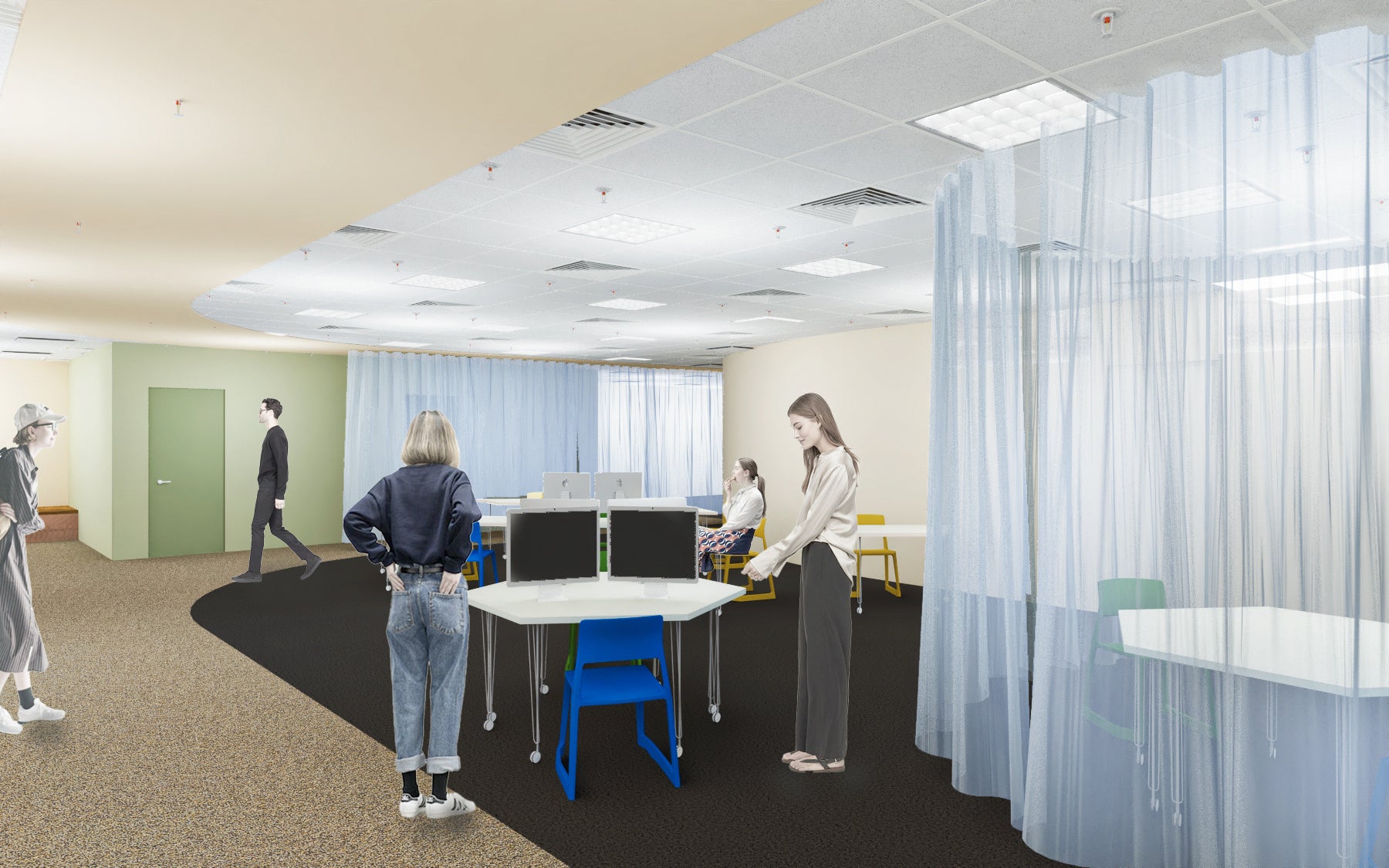 社員の多様なアクティビティに柔軟に対応できるように、恒久的な壁は必要最低限に留め、プランを自由に変更できるようインテリアエレメントを提案しています。