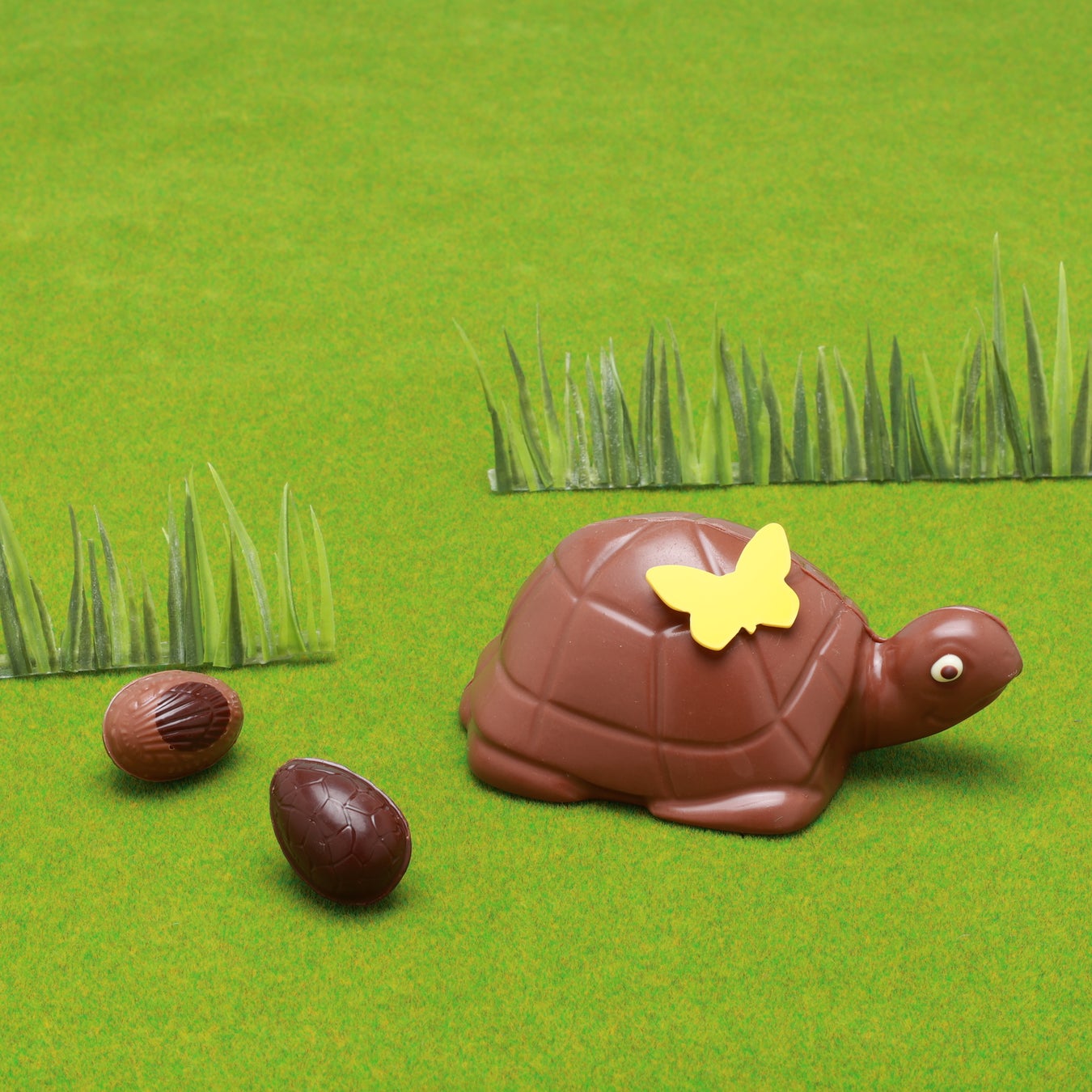 カメの中には 香ばしいプラリネを詰めた2種の卵型のボンボンショコラ「ウフ」が入っています。