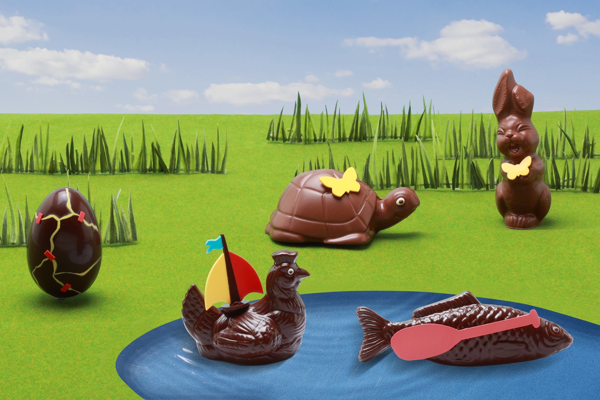 ピエスモンテ(チョコレート細工)を生み出しました。春になって動き出す動物や復活の象徴の卵、キリストの起こした奇跡に由来を持つ魚の形をした可愛らしいボンボンショコラも登場します。