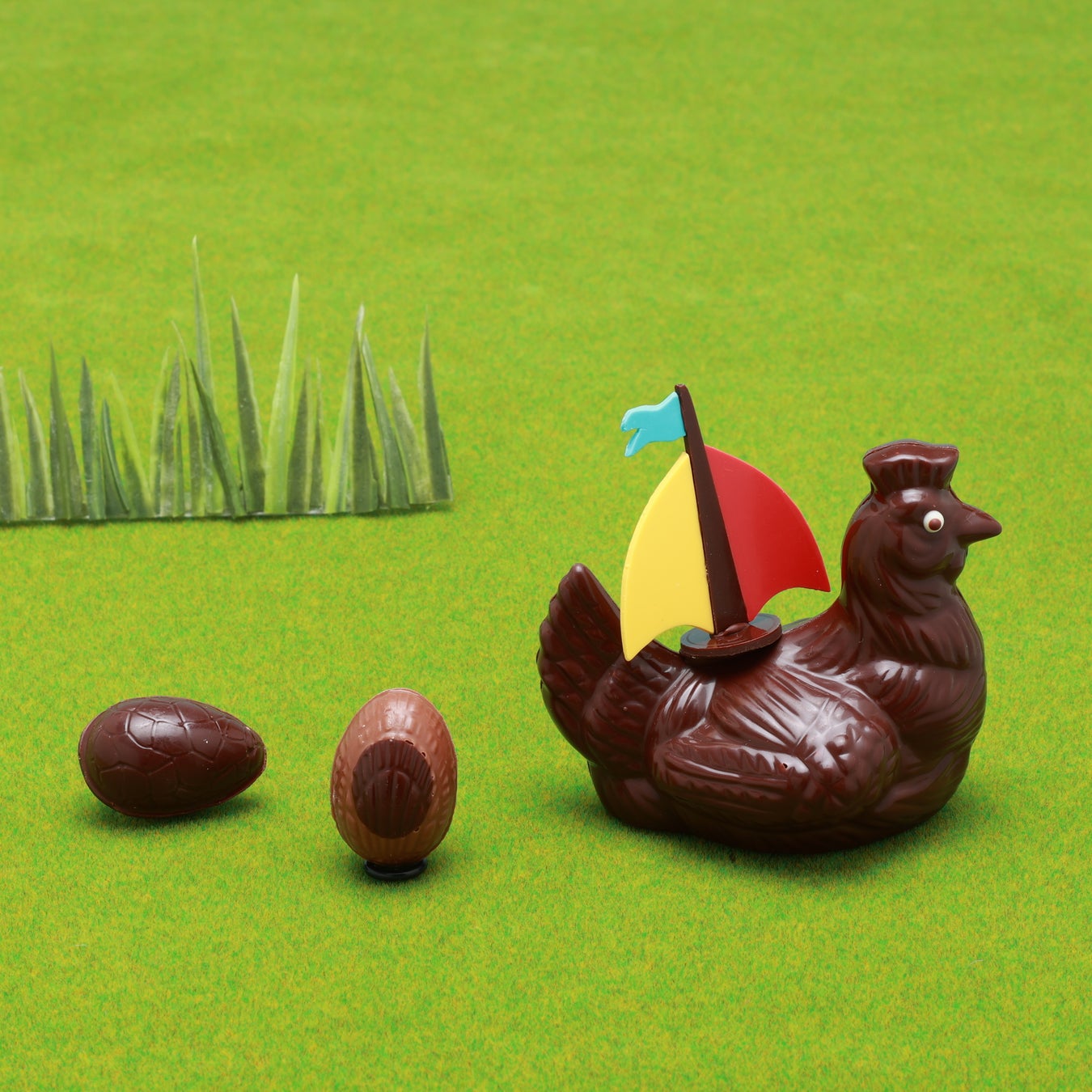 帆をつけて楽々と動き回る水鶏の中には、2種の卵型のボンボンショコラ「ウフ」が入っています。