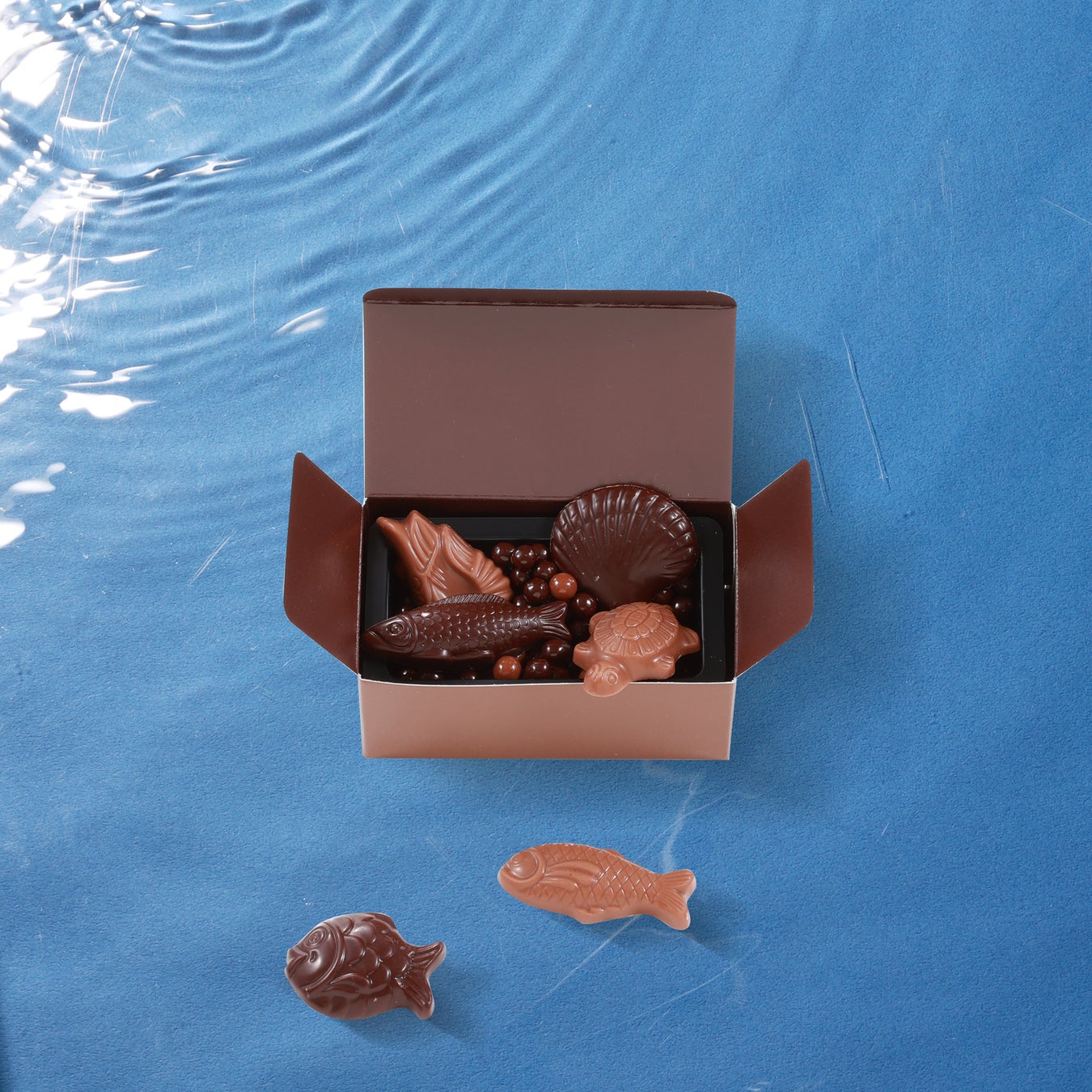 海の生き物をかたどったチョコレート6個と、粒状のショコラ「ペルル クラッカントゥ ショコラ メランジュ」の詰合せ。