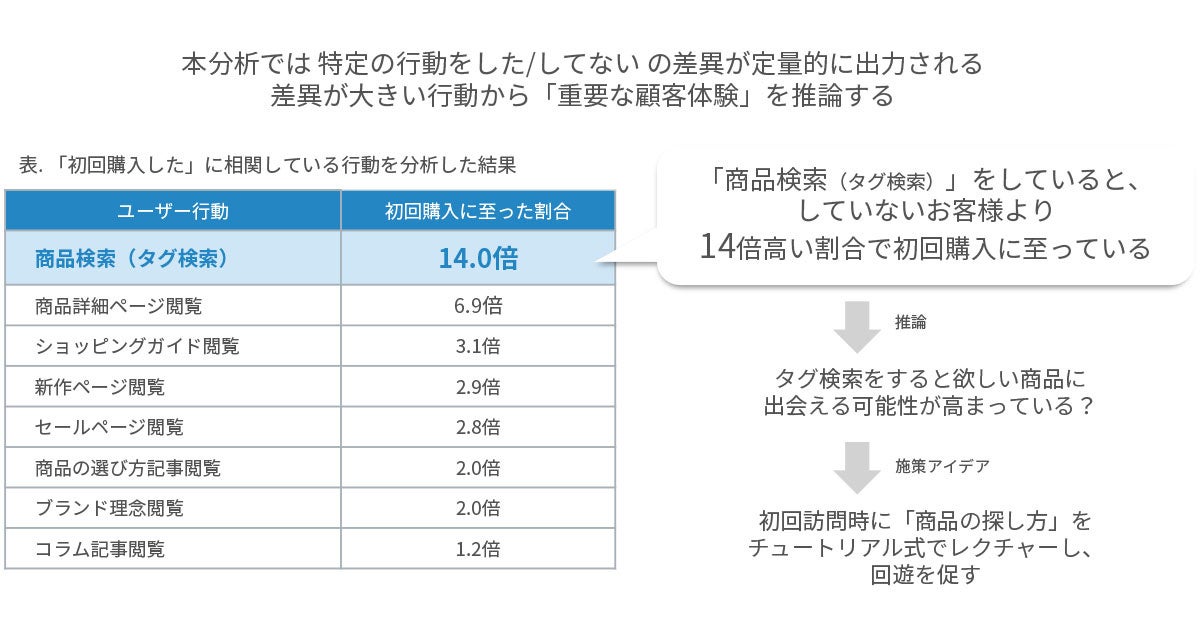 実際に、あるアパレルECサイトでは、「商品検索(タグ検索)」をした顧客は、していない顧客に比べて14倍も初回購入に至ったという分析結果が出たという事例もあります。そこから、初回訪問時に「商品の探し方」を案内することで初回購入率が高まるのではないかという仮説が立てられます。