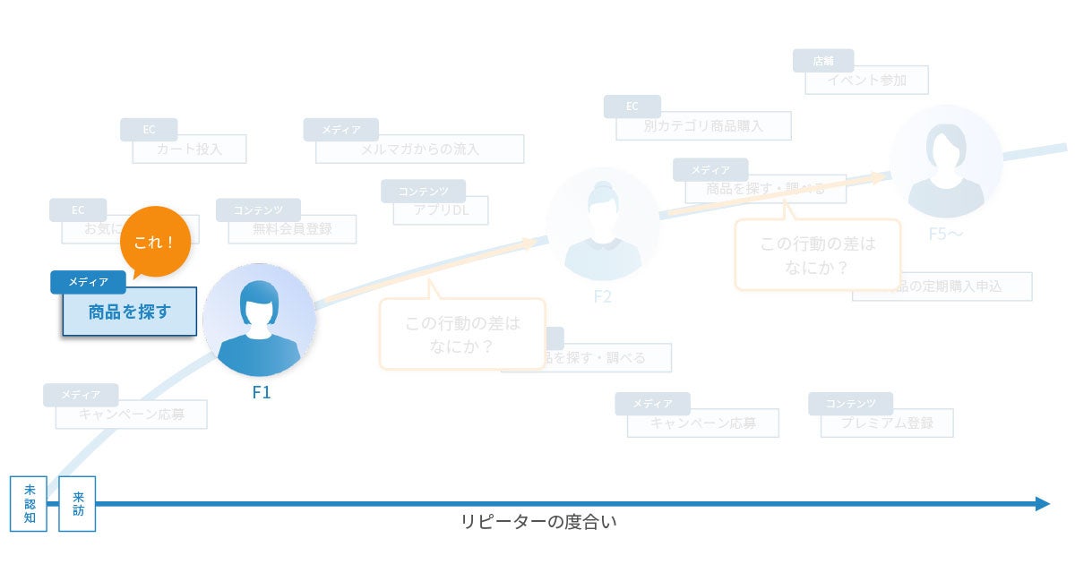 ここでは、初回購入に影響を与えていた要因として「商品を探す」があったことがわかったとします。
