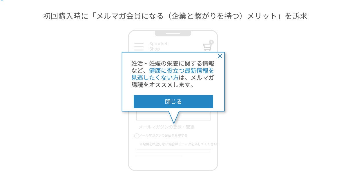 そこで、初回購入者に向けて、メルマガ会員になることのメリットをWeb接客で訴求。この施策により、メルマガ登録率を改善するとともにF2転換率も高められるというわけです。
