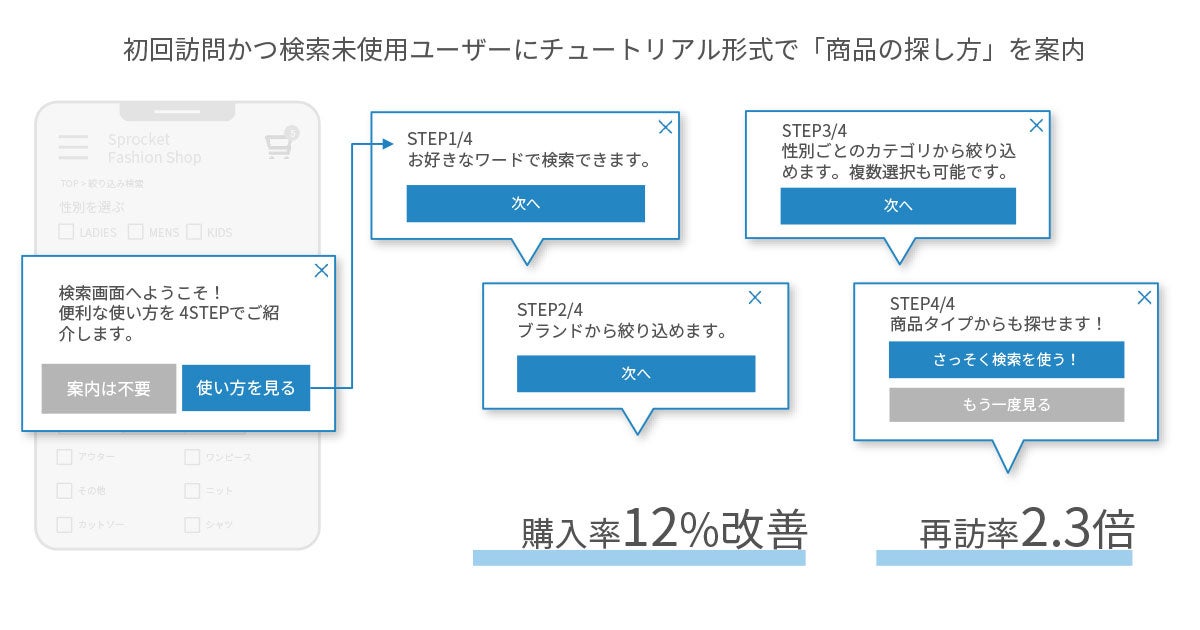 そこで、初回訪問かつ商品検索未使用ユーザーに、チュートリアル形式のWeb接客で「商品検索」の方法を案内します。実際にこの施策を運用したケースでは、購入率は12%改善しました。副次的に再訪率も2.3倍に高まりました。