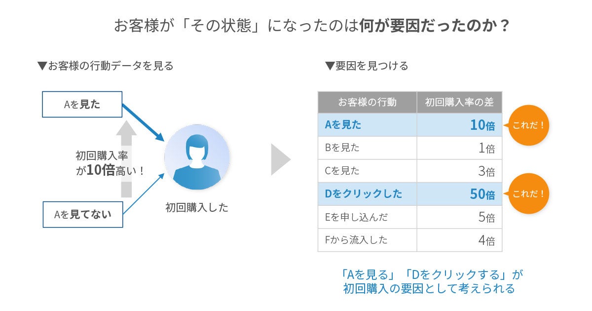 初回購入をした/しない、リピーターになった/ならないというユーザーの行動の差には、そこに影響を与えている要因があります。それがわかれば、「何をすれば良いのか?」